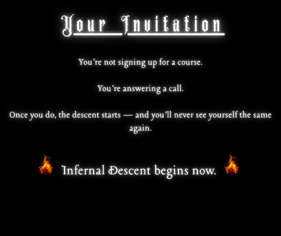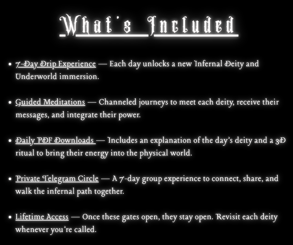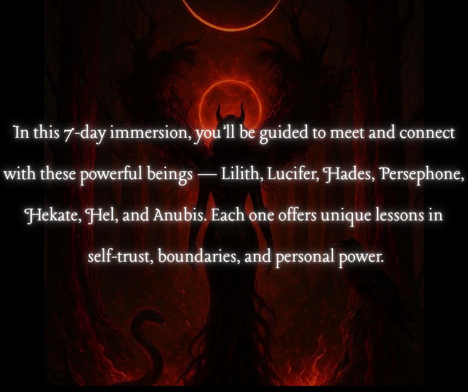 Infernal Descent is a 7-day self-guided immersion designed to initiate you into the current of seven Infernal Deities — the primordial forces of transformation that dwell beneath the veil.