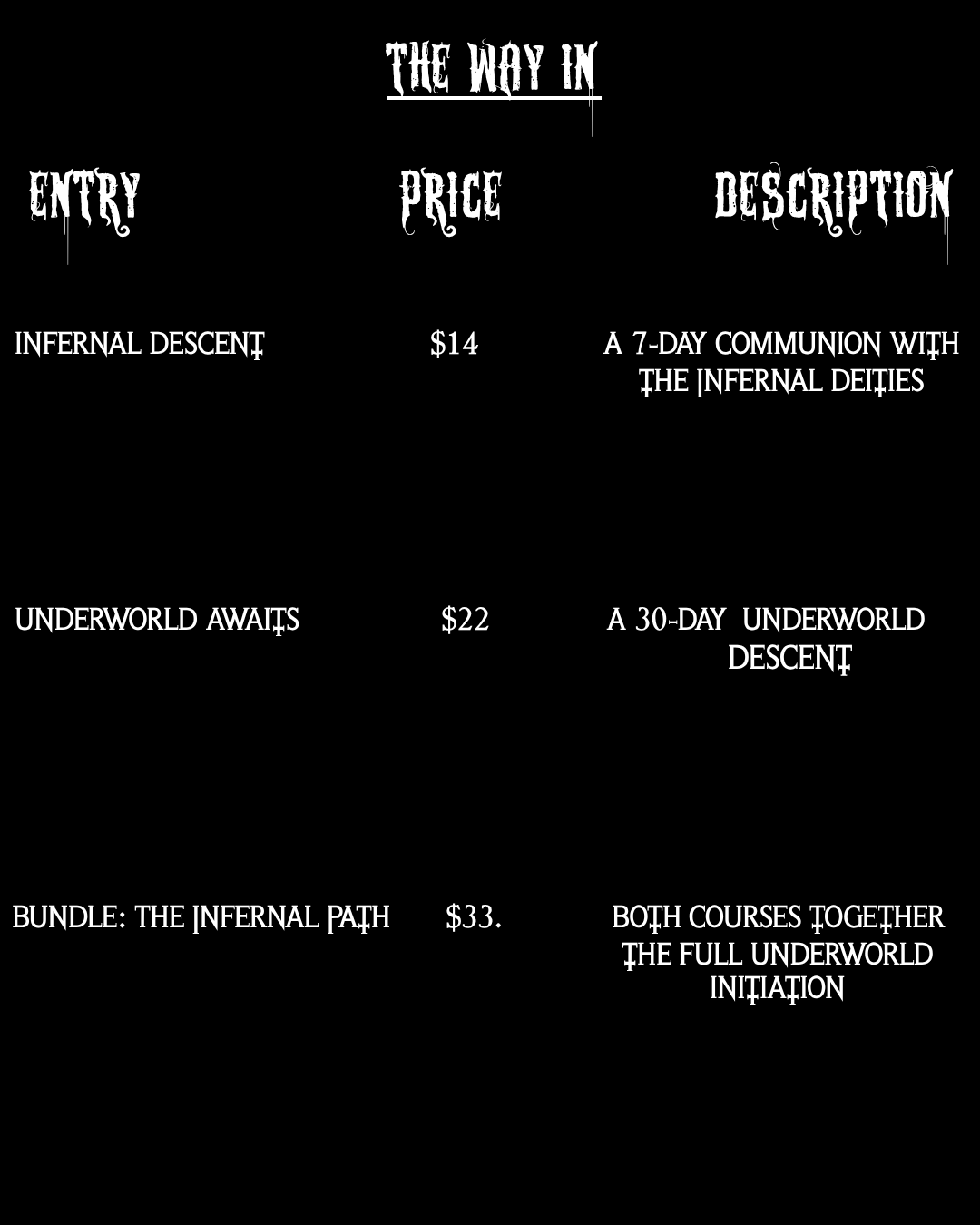You can still enter this path through the bundle option. Begin with the original 7-day immersion meeting the Infernal Deities and learning their energy before continuing into Underworld Awaits for the deeper work.