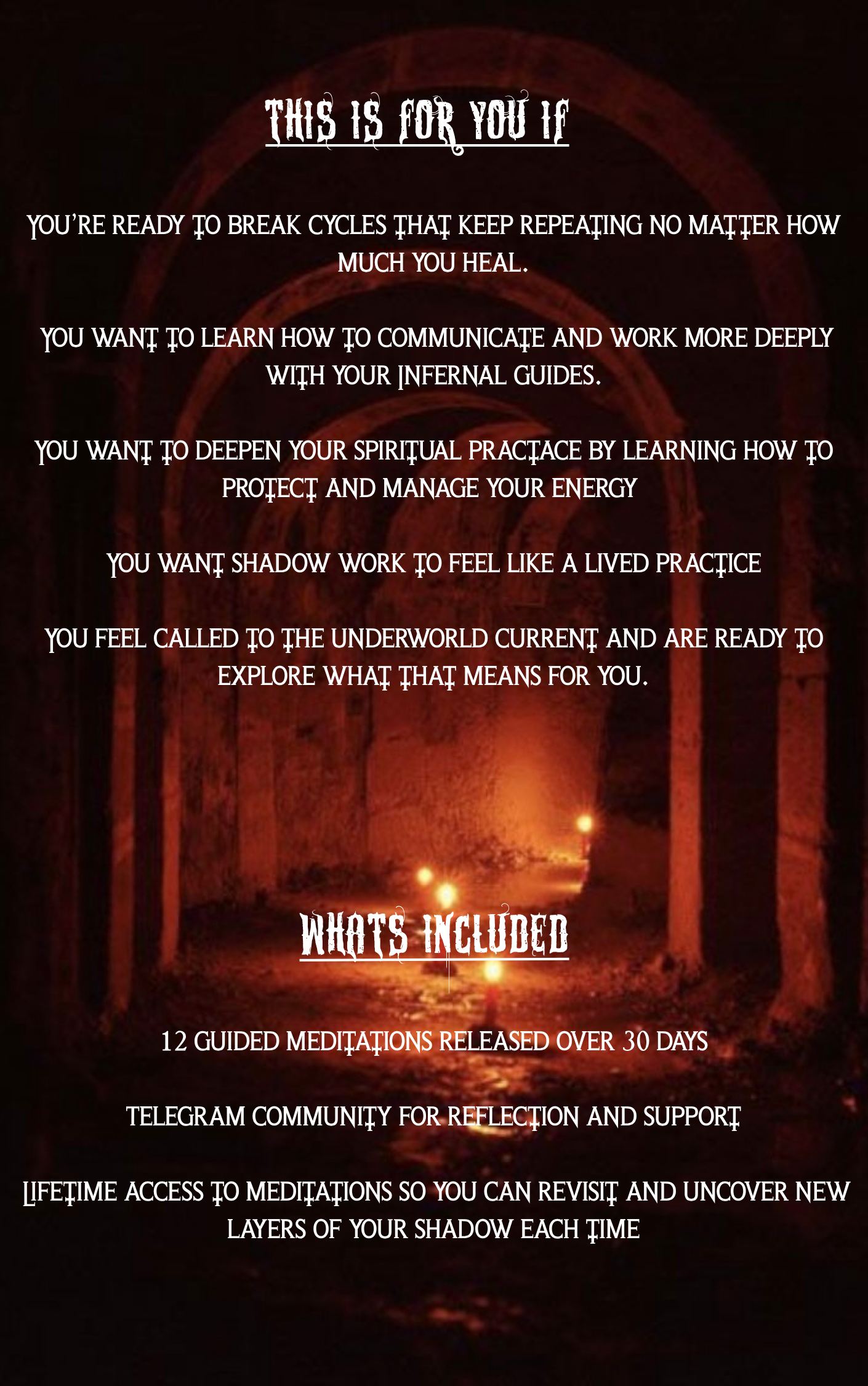 Across 12 meditations released throughout a 30 day period, we will begin to explore the deeper layers of self that still hold you in karmic cycles, break down old contracts that keep you bound, reclaim lost fragments of your soul, deepen your relationship with the Infernals and learn to work with them through divination, spellwork, and ritual.